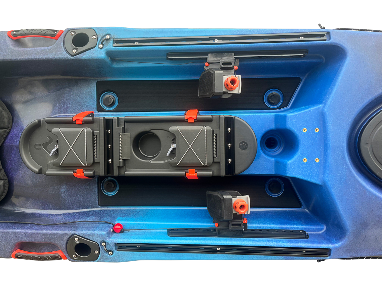 The contoured seating area comes with the comfortable flex seating system which is sure to keep paddlers comfortable for a full days paddling out on the water. A Versa centre console has dual mini hatches, magnetic gear holder, a bottle holder and 2 gear tracks ready for mounting, to the front of this console is a transducer scupper hole with hull recess which makes mounting fish finders simple and easy. A large rear storage tank along with an oval bow hatch with twist lock and rear screwed hatch ensure you are never short on storage for all your gear. The included Vibe Gravity Rudder system is perfect for if conditions turn to enhance on the water handling, it is also Bixpy Motor Ready meaning the Vibe Kayaks Hydra 130 Angler can be turning into a motor kayak. The features are well rounded and also include deck padding under the adjustable foot pegs for added grip, bow rod tip holders, bow quick paddle parks, paddle parks either side of the seated position, tracks and 4 flush mounted rod holders. Top loading track mounts to the front of the seating position as well as to the rear of the kayak near the stern handle ensure paddlers can mount, rod holders, camera/go pro mounts, flags, lights or anything else required quickly and easily.