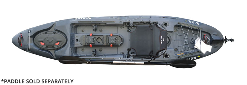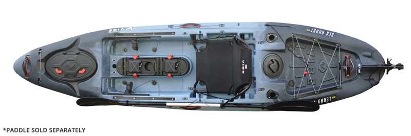 The Sea Ghost come feature packed including Vibe Kayaks Dual Position Hero Seating System that is comfortable and adjustable giving a great position to spend the day on the water. The included toe controlled rudder system allows for easy paddling when the weather starts to turn. The Sea Ghost 110 also comes equipt with a great sized oval front hatch with easy to use twist locks, this gives great access to the internal storage. A centre console that is easy to get to offers more storage while the rest of the Sea Ghost has various accessory slide tracks, flush rod holders and a large rear storage tank make the Sea Ghost a top spec kayak for both sit on top fishing or for sit on top touring kayaking.